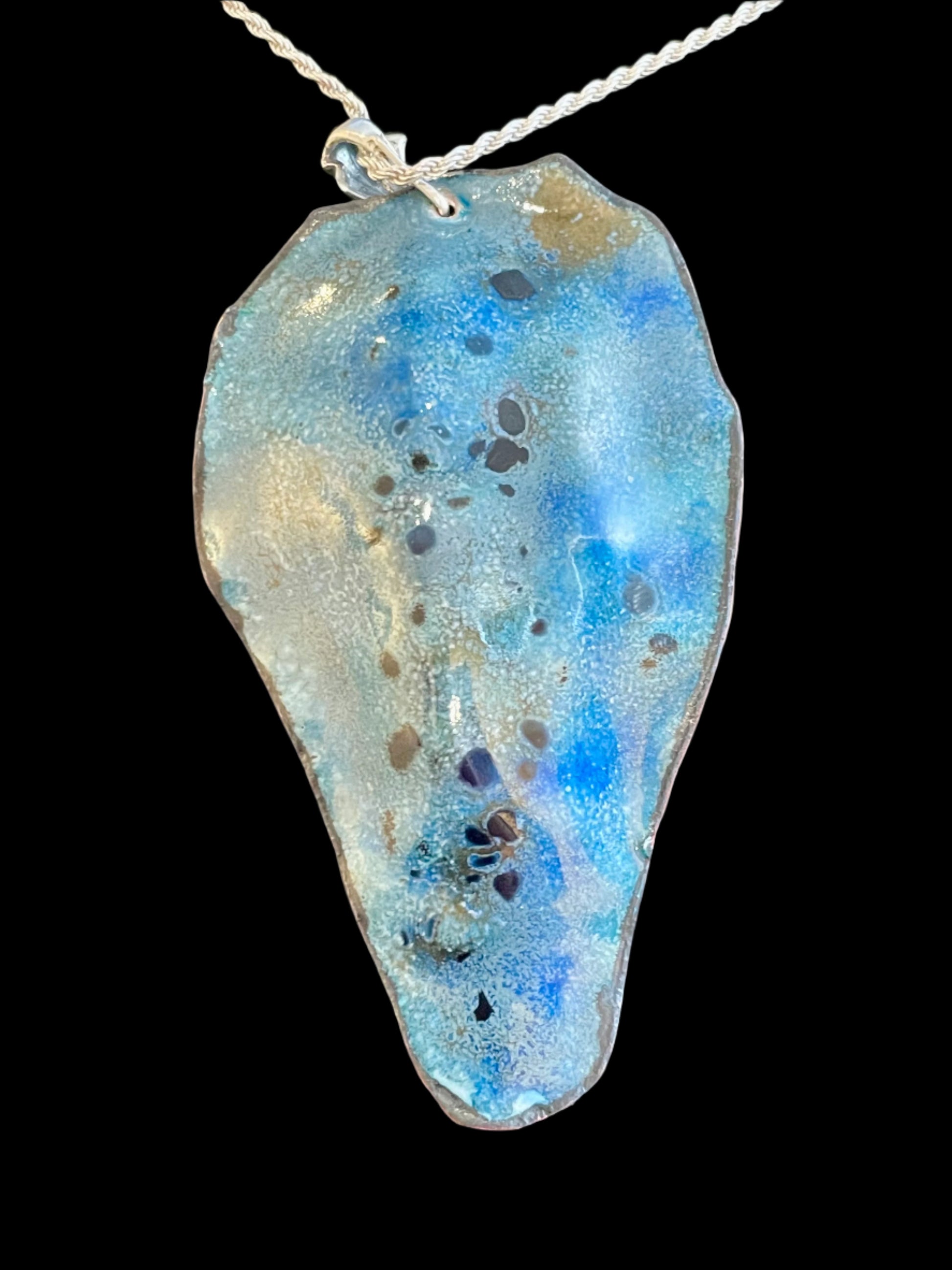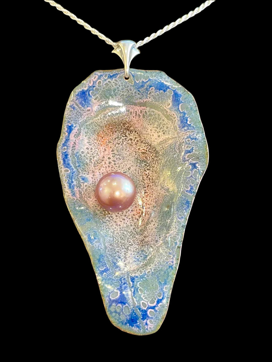 A beautiful 14mm Edison pearl mounted to a hand forged oyster shell made from many layers of vitreous enamel on copper. The sterling bail and nice twisted rope chain accentuate the piece beautifully. Pendant measures 90x55 mm Hand made in Las Cruces, NM