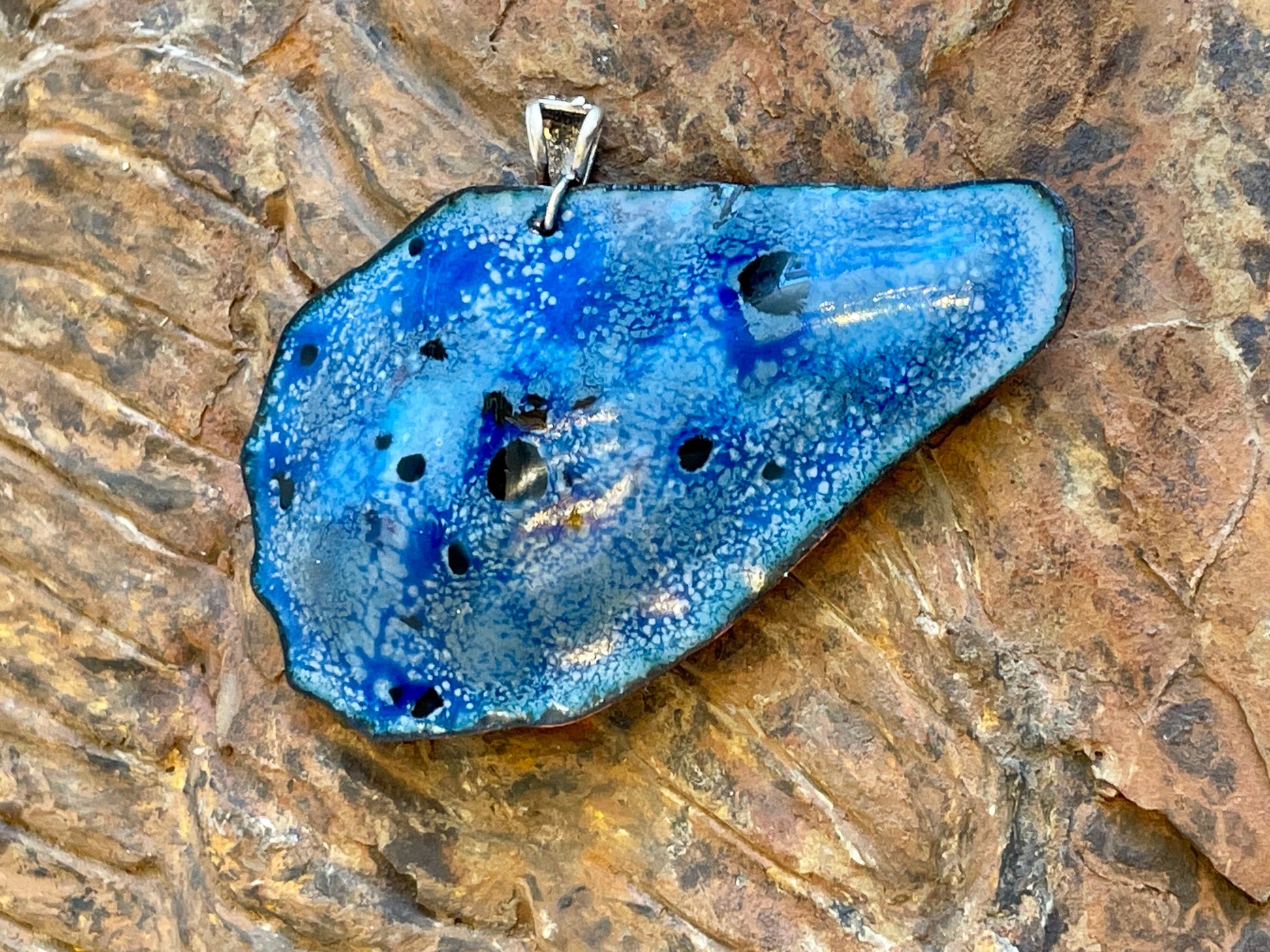 A beautiful 8.5mm Edison pearl mounted to a hand forged oyster shell made from many layers of vitreous enamel on copper. The sterling bail and nice heavy sterling chain (20 in) accentuate the piece beautifully. Pendant measures 40x70mm Hand made in Las Cruces, NM