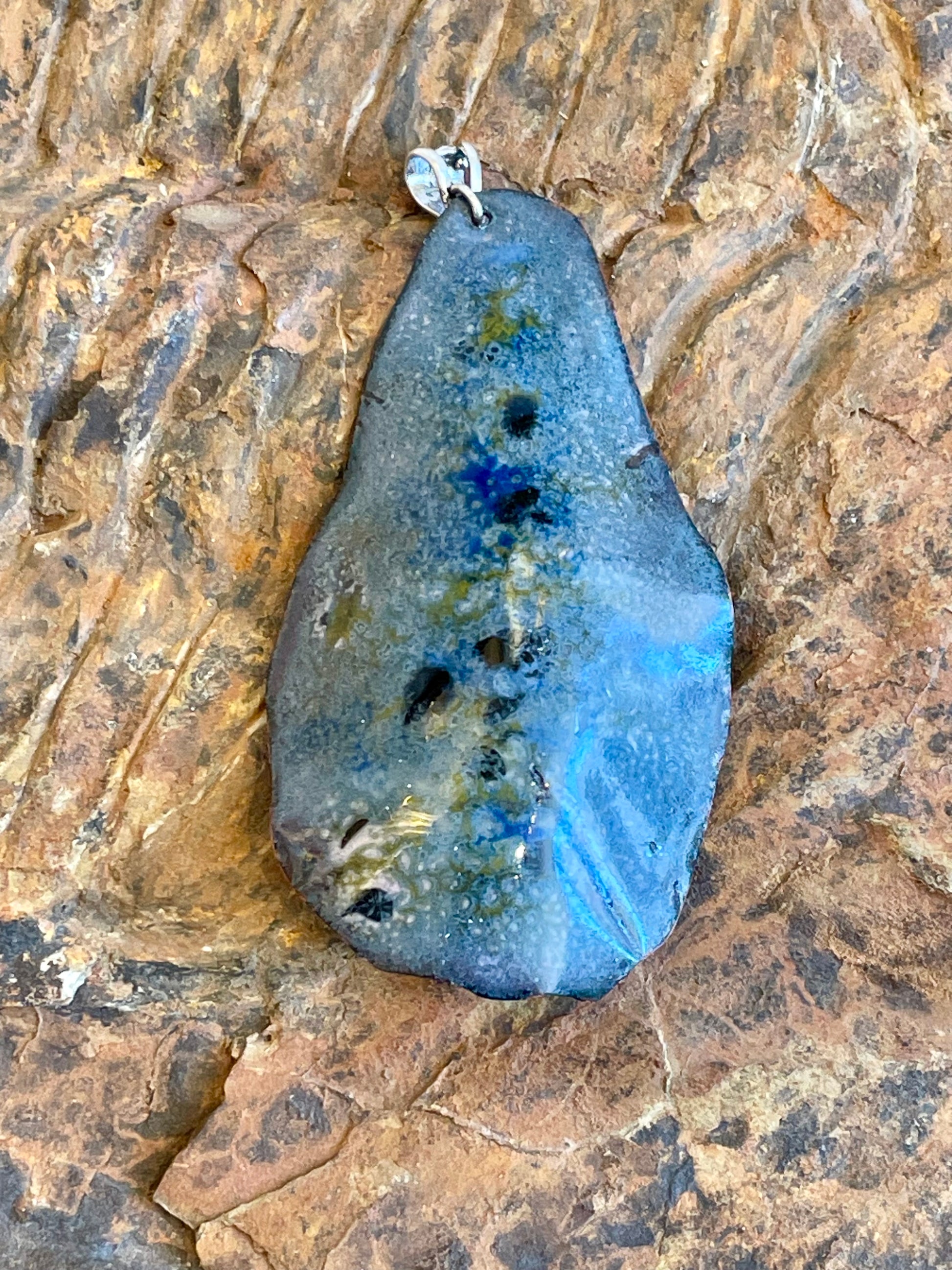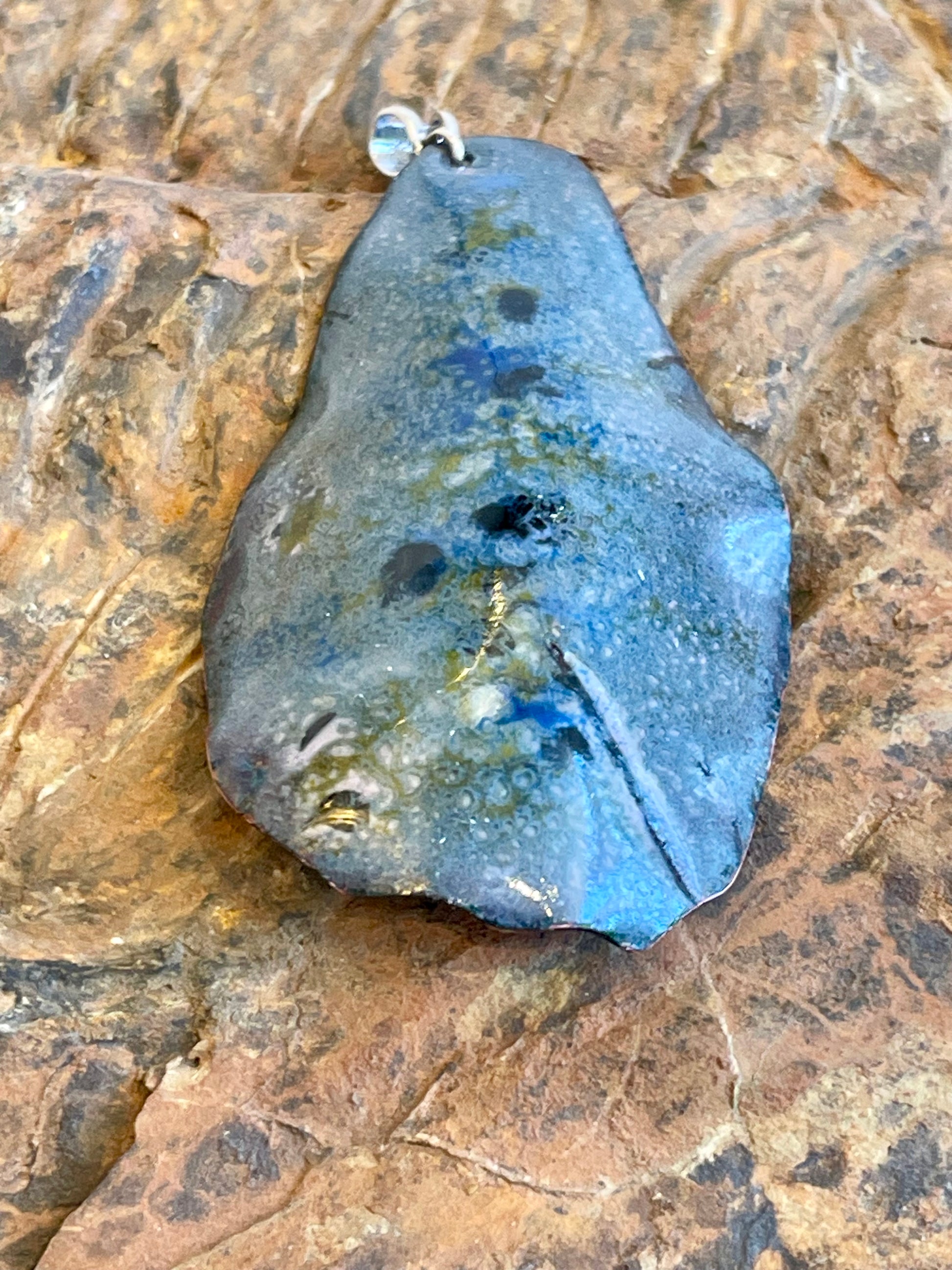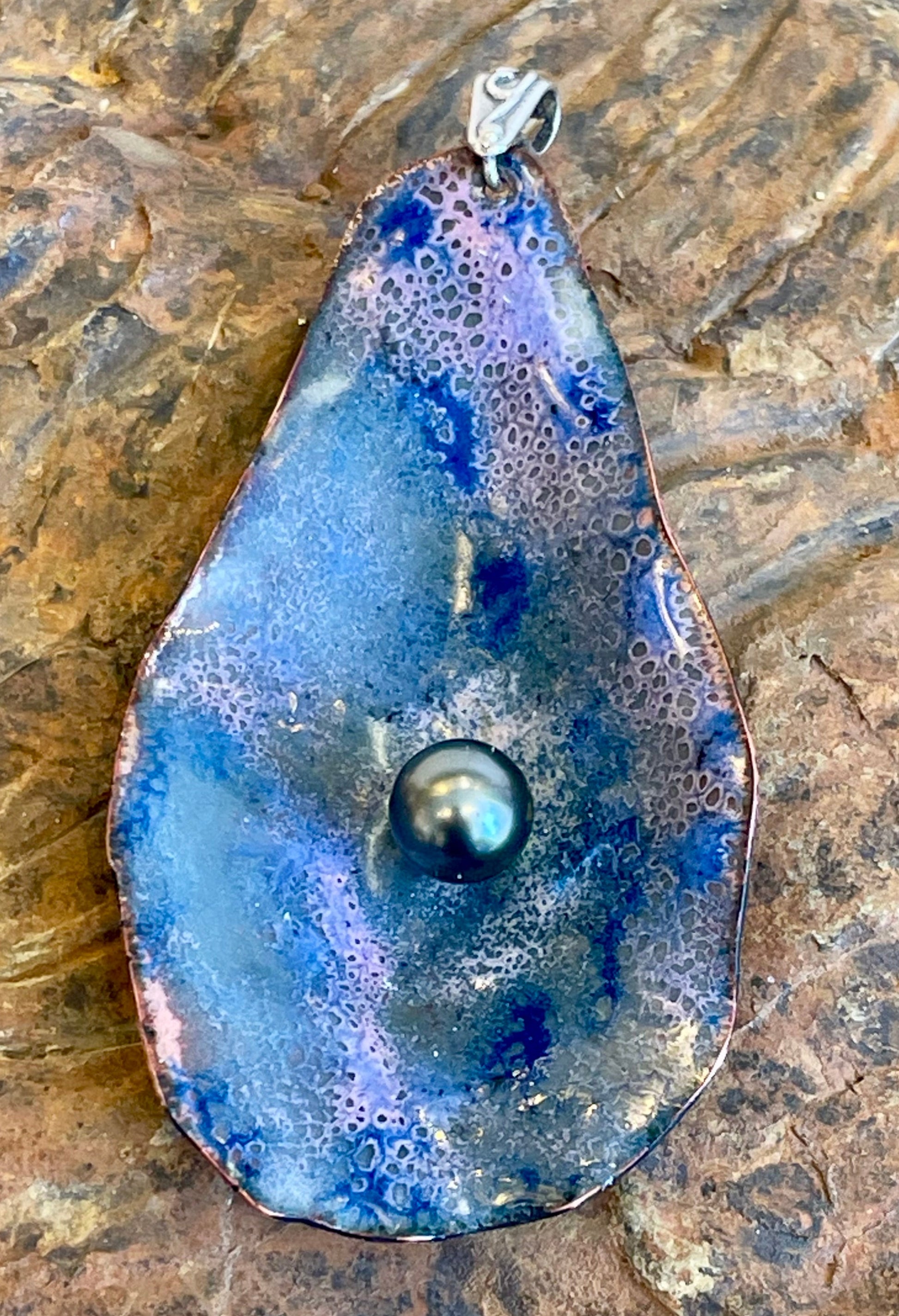 A beautiful 8.5mm Edison pearl mounted to a hand forged oyster shell made from many layers of vitreous enamel on copper. The sterling bail and nice black oxidized flat cable sterling chain (21 in) accentuate the piece beautifully. Pendant measures 70x40mm Hand made in Las Cruces, NM