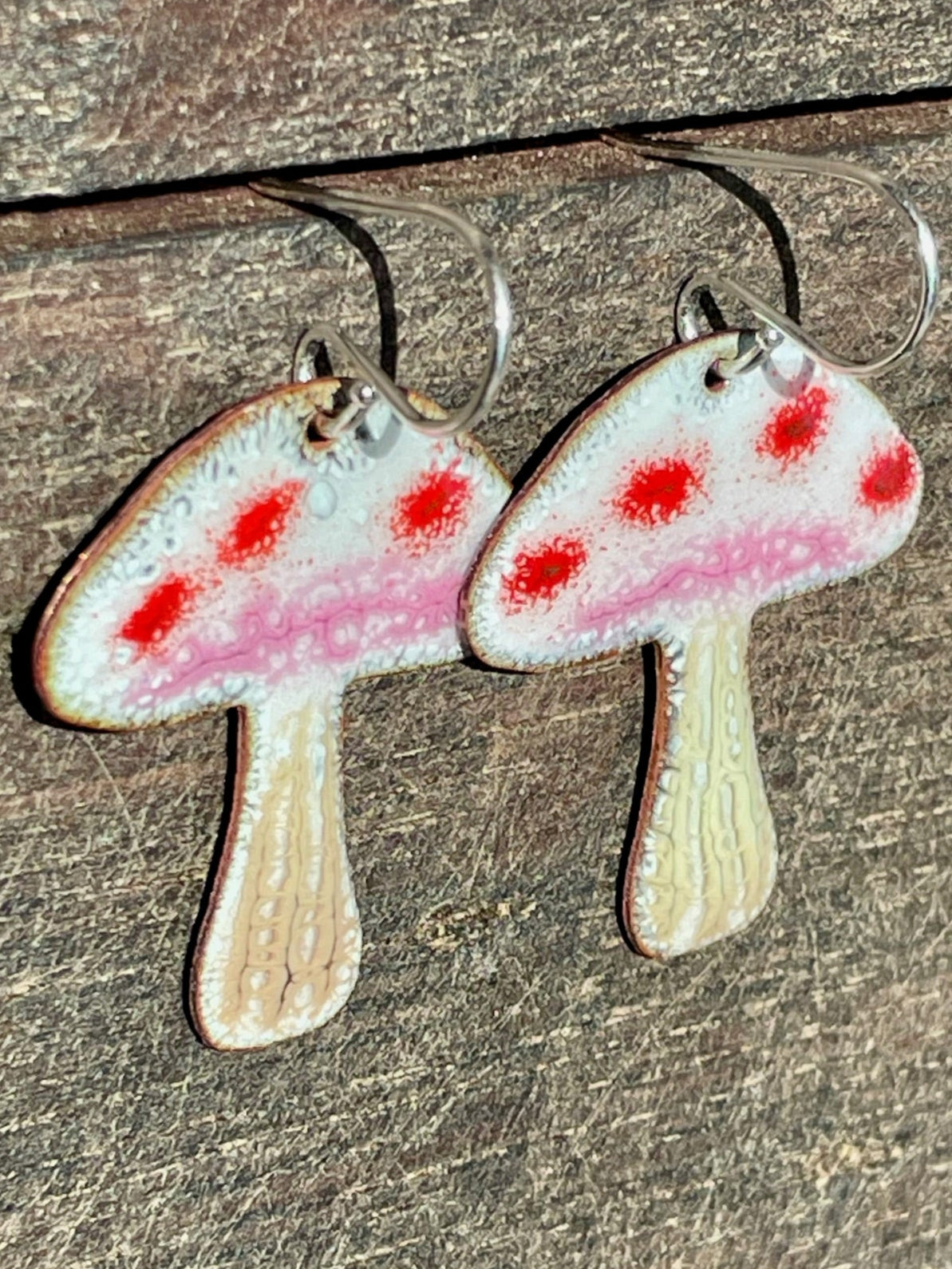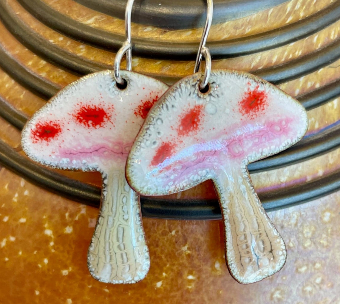 Cute mushroom earrings with five layers of vitreous enamel over copper, Argentium ear wires. Measure 30x30mm with a drop of 40mm.