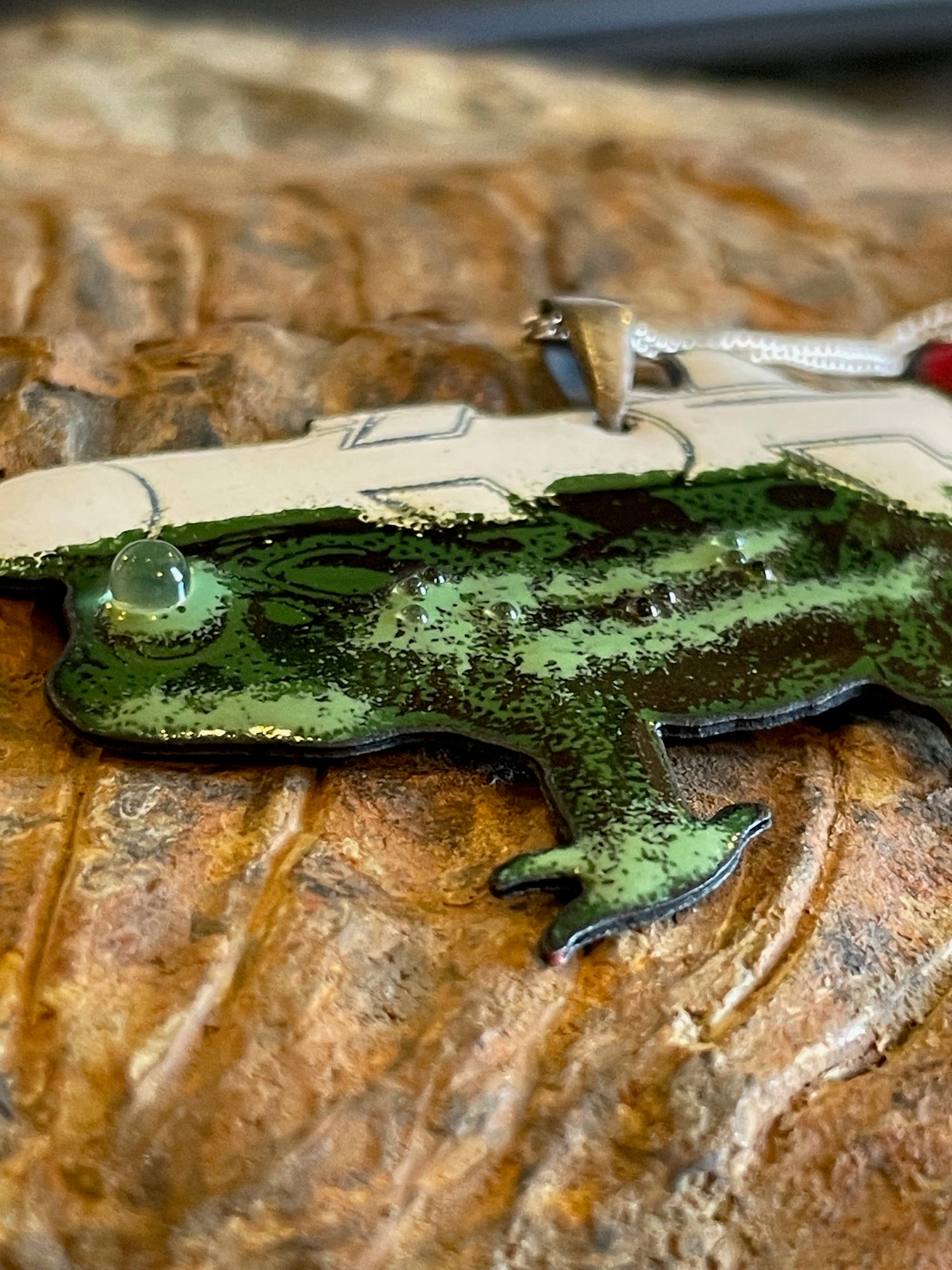 Enamel on copper missletoad on a sterling silver chain with sterling silver bail. Awesome texture and reflective beads. We all know what happens under the missletoad, right? Pendant measures 73x35mm, chain is 18 inches. Hand made in Las Cruces, NM