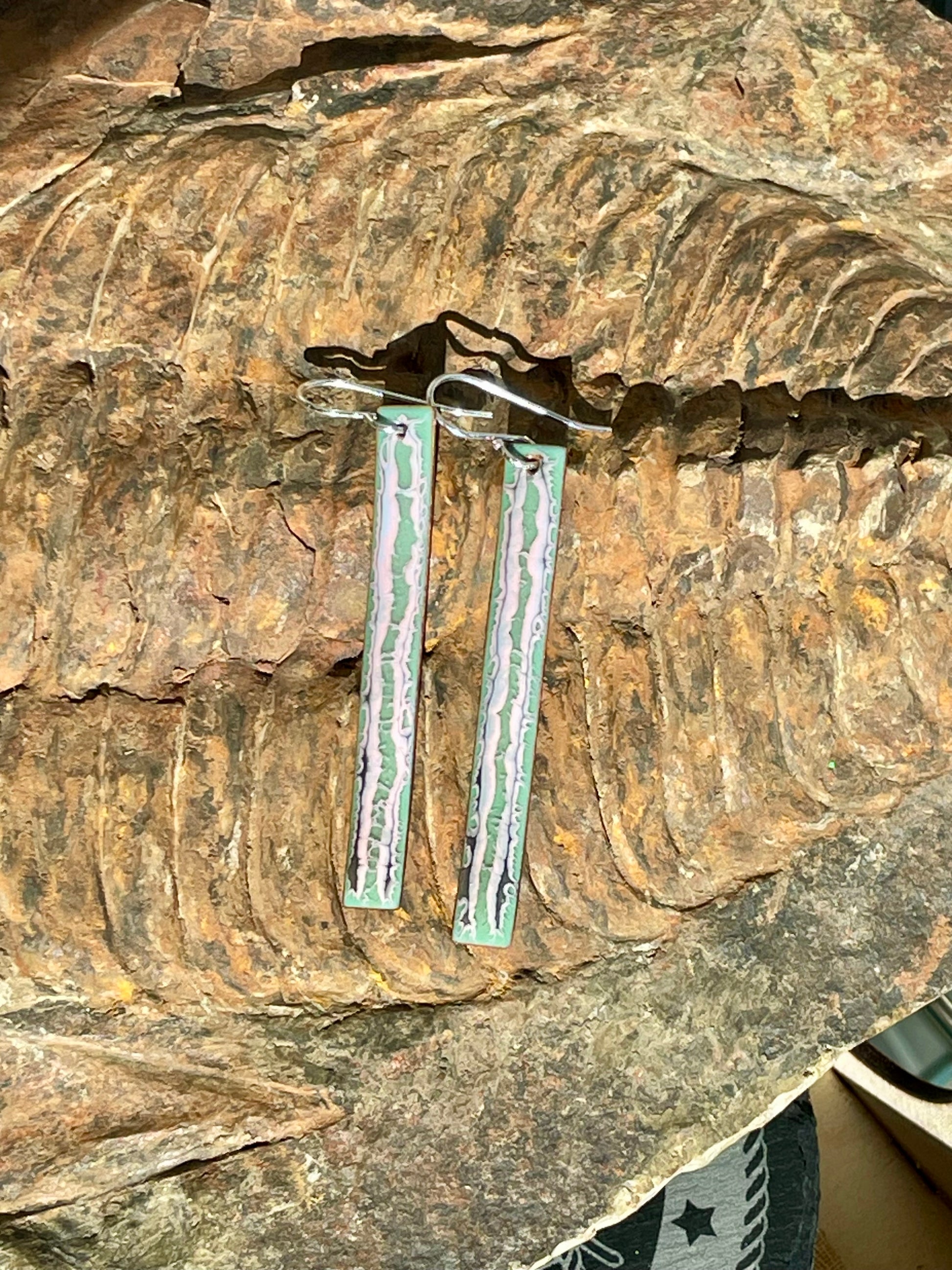 Incredible pastel earrings, 4 layers of vitreous enamel on copper, dark blue counter enamel on back. Argentium ear wires. Measure 55x7mm with a drop of 67mm. Hand made in Las Cruces, NM