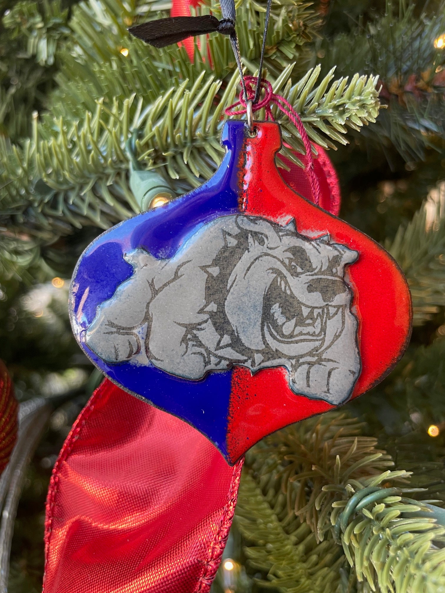 Multiple layer of vitreous enamel and copper make up this awesome LCHS Bulldogs Christmas ornament, hand made in Las Cruces, NM, measures 2 5/8 inches.